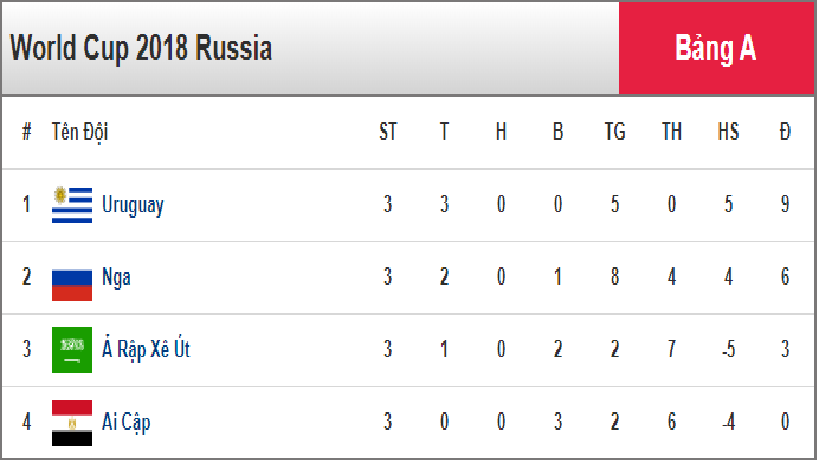 Như vậy, bảng A của world cup năm nay đã được phân định. Ai về ai ở cũng đã rõ. Với 3 trận toàn thắng, Uruguay được trọn vẹn 9 điểm và xếp đầu bảng A. Trong khi đó tuyển Nga thì có 6 điểm và giành suất nhì bảng.
